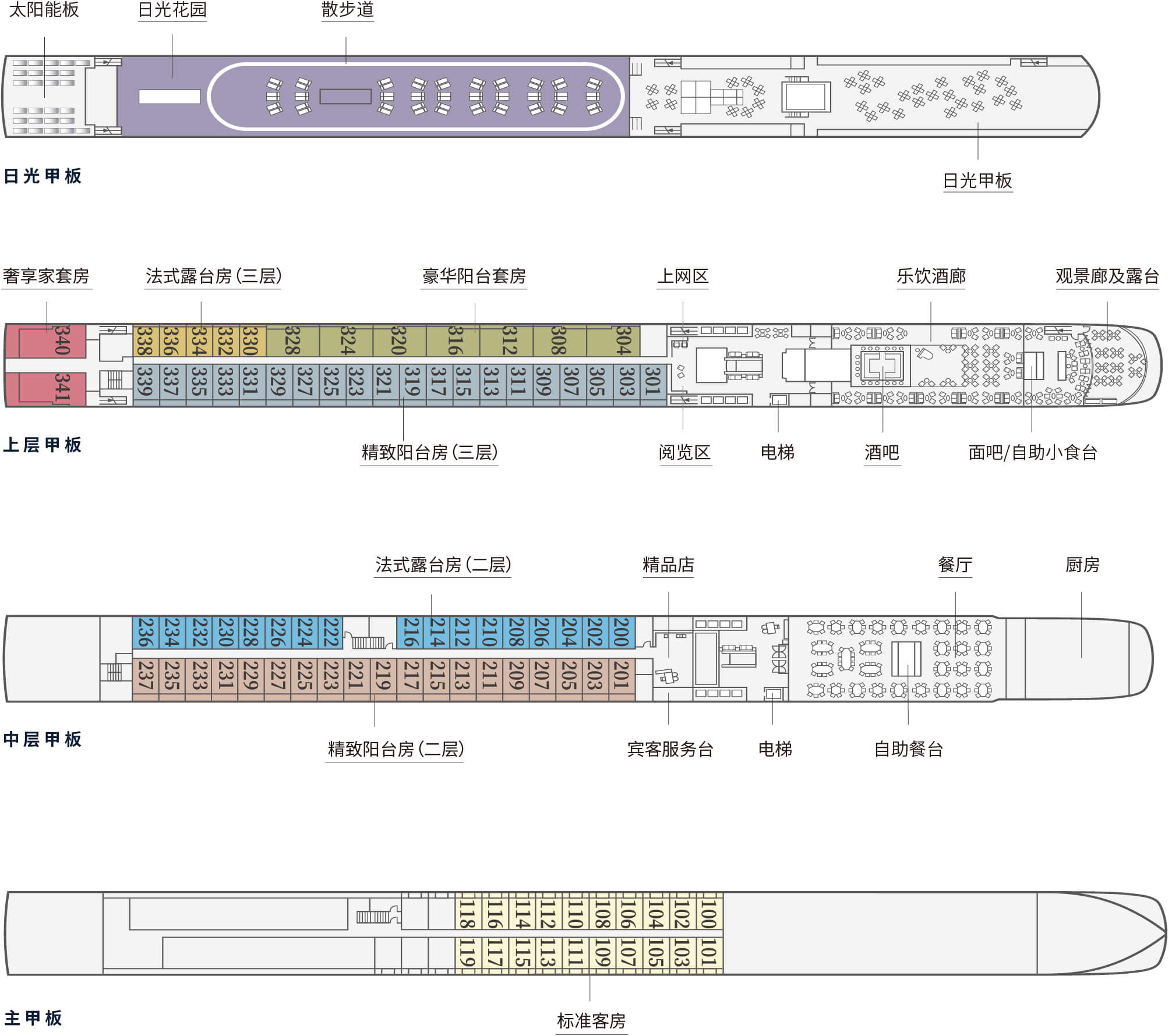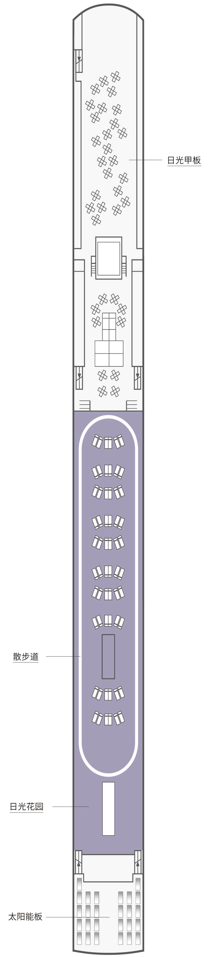 日光甲板是您放松身心、观赏360度两岸全景的好去处。躺在休闲椅上,静享惬意的午后,或者和亲友在这里享受沙狐球及迷你高尔夫的乐趣,还是看看我们日光花园里种了哪些主厨会采摘使用的香草。这里也设有方便您晨练、散步的步道。