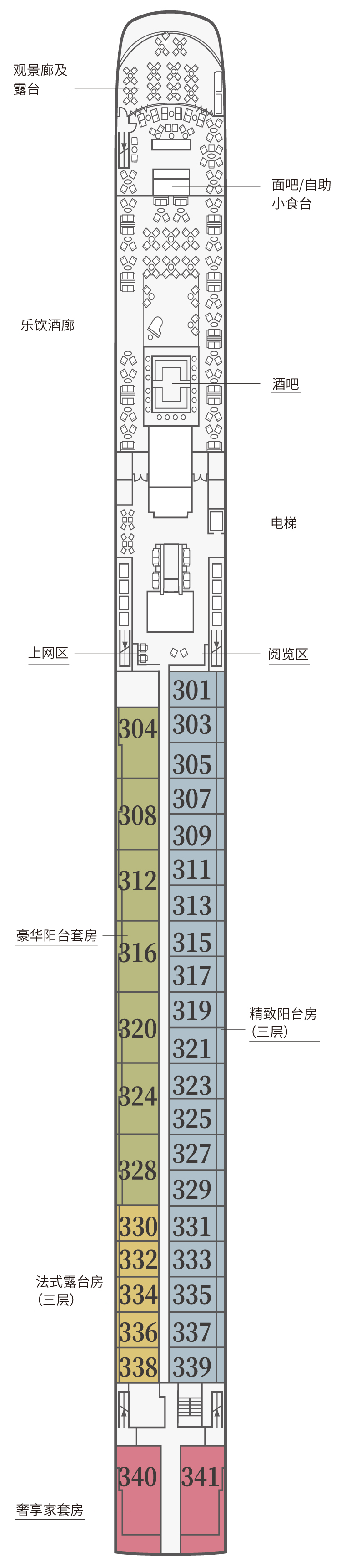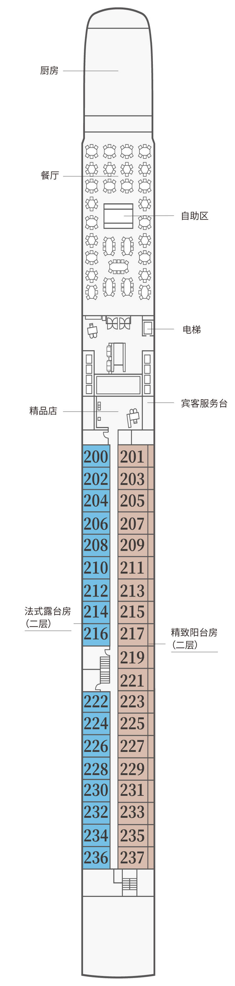 位于上层甲板船头,观景露台是个供您享用简餐及餐间小食的休闲半户外空间,户外座席为您的欧洲内河之旅提供了两岸变幻美景零距离的用餐体验。此处也设有我们颇受欢迎的面吧,并且将提供具有古早味的中华点心与小食,适合您在此与伙伴小聚。