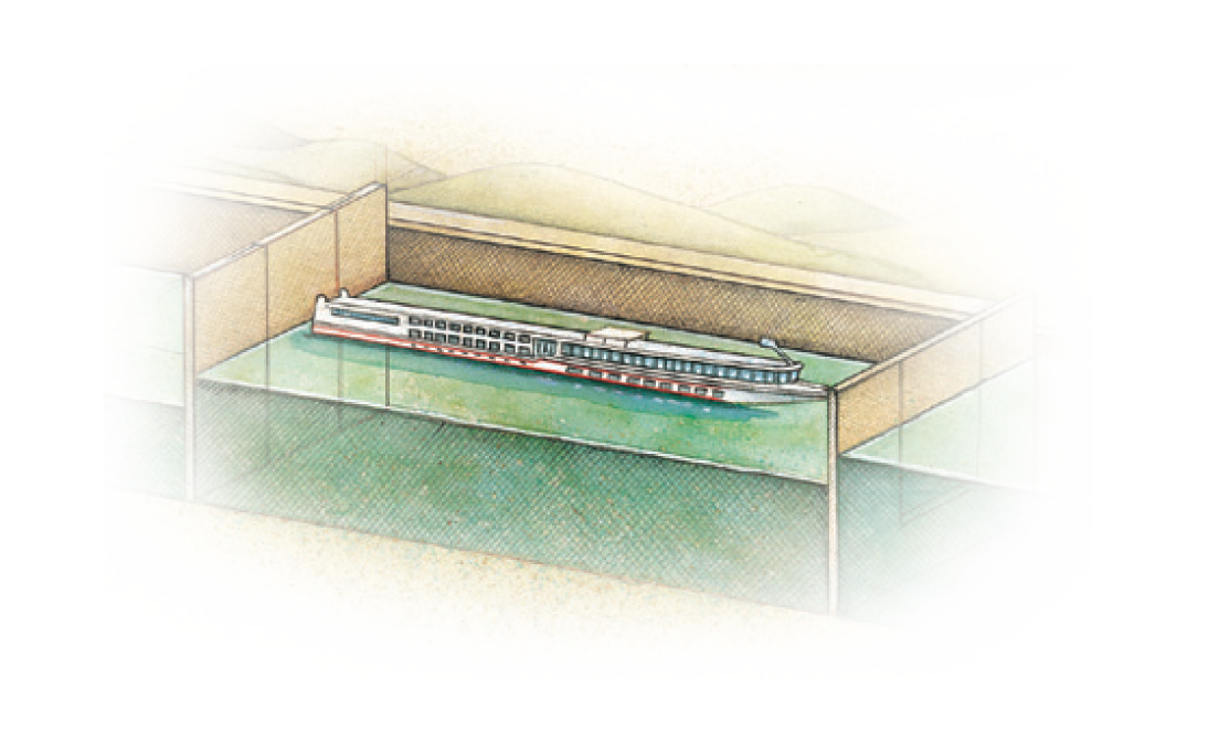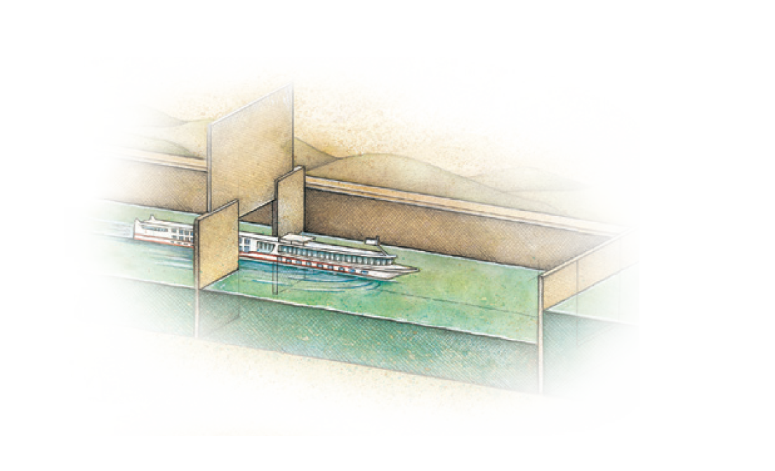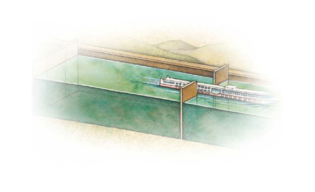 船闸内部注满水,将船托高。船闸也可以抽干从高水位进入的船只所带入的水,将船放低。